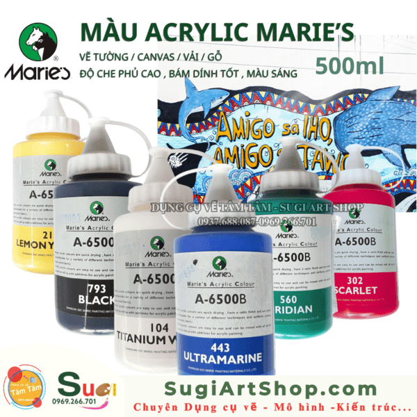 | Tên sản phẩm | Màu acrylic Marie’s bình vòi 500ml , Màu Acrylic Marie’s vẽ lên nhiều chất liệu |