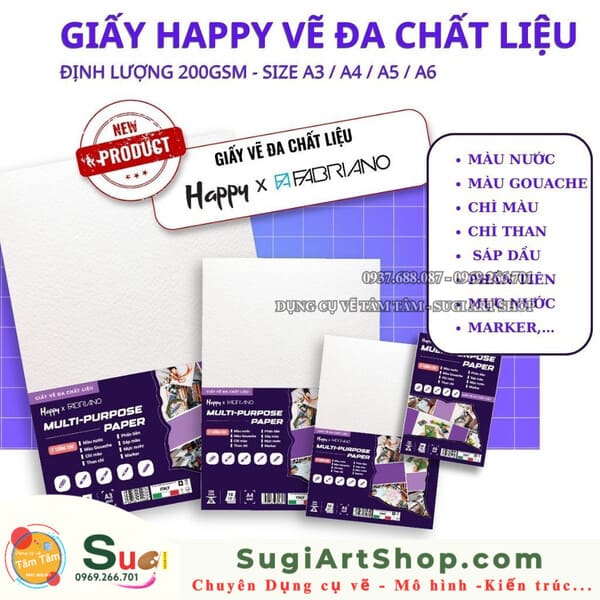 | Tên sản phẩm | Giấy Vẽ Happy 200gsm , Giấy vẽ đa chất hiệu Multi Purpose Paper 200gsm |