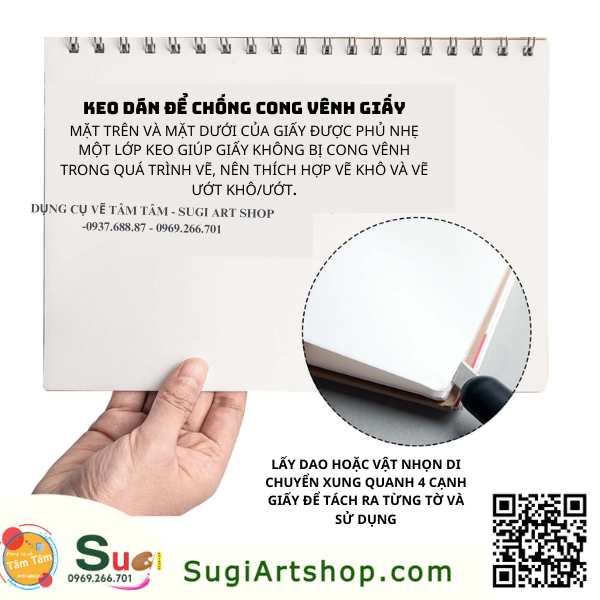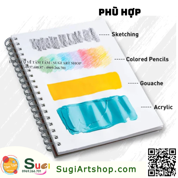 | Ứng dụng | Giấy có độ dày vừa phải 160gsm, bề mặt có vân nhẹ, thích hợp vẽ đa chất liệu từ chì, chì màu, line sketch. gouache, acrylic, màu sáp, màu nước nhẹ nhàng,. |